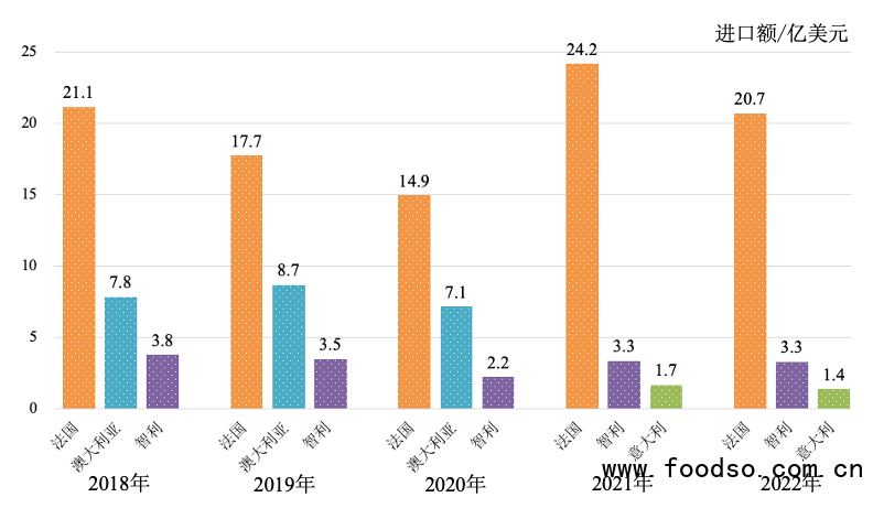 2022年,我國葡萄酒前5大進口來源地分別為法國、智利、意大利、西班牙和美國。其中,自法國進口20.7億美元,占72.5%;自智利進口3.3億美元,占11.5%;自意大利進口1.4億美元,占4.8%(圖6)。