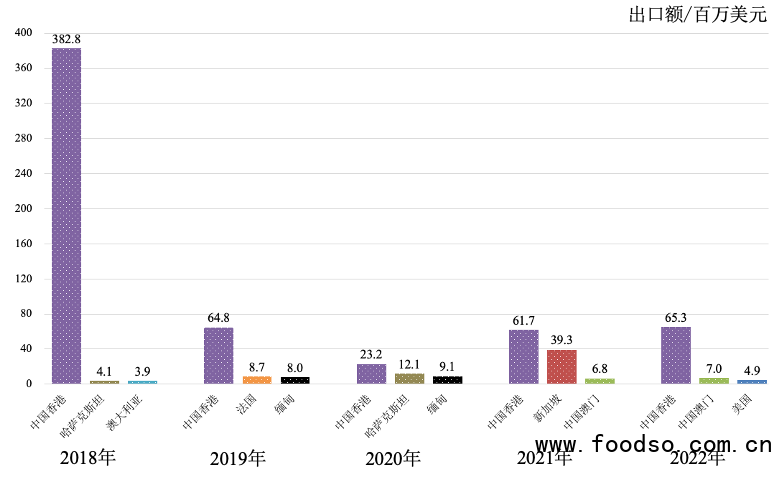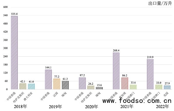 圖8 2018—2022年我國葡萄酒前三大出口市場出口量