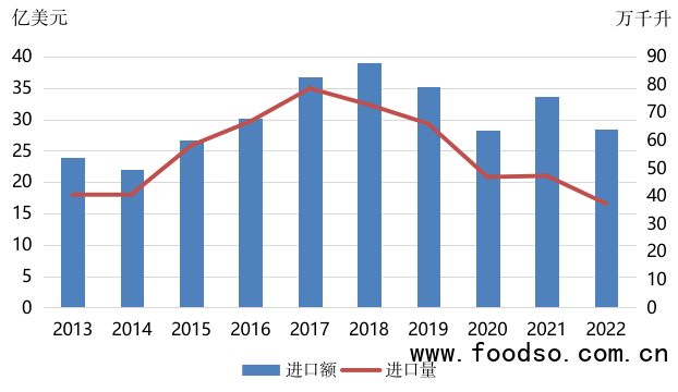 圖2 2013—2022年我國葡萄酒進口情況