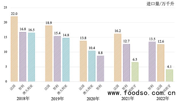 從進口量看,2013—2017年,我國葡萄酒進口量呈逐年上升趨勢,年均增長18.0%。2018—2022年,受反傾銷調(diào)查和新冠疫情等因素影響,我國葡萄酒進口量呈逐年減少趨勢,由2018年的72.7萬千升減至2022年的37.3萬千升。